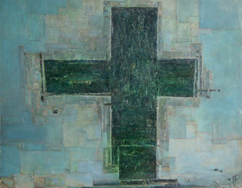 Peace I was very affected by the Indonesian Tsunami and the force of Mother Nature. This series was inspired, amongst other things, by the constant barrage of these pixelated images flashing across our TV's of aerial shots of the islands and land under water and water over land. The islands became dark green crosses in a sea of the most beautiful blues, greens and aquas. The eagle's eye view of the peace after the storm. |